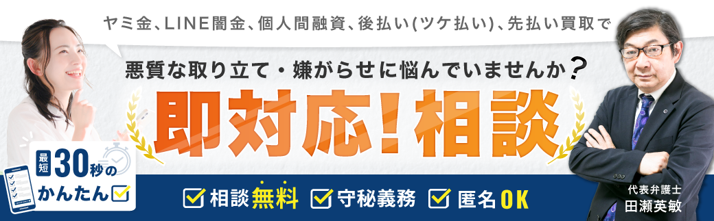 2つの質問に答えていただくだけで、webから最短30秒で簡単に相談ができます。選択肢から回答をタップしてください。 Q1 取引業者の種類を教えてください 後払い・ツケ払い 先払い現金化 闇金・ソフト闇金 違法ファクタリング業者 不明・その他